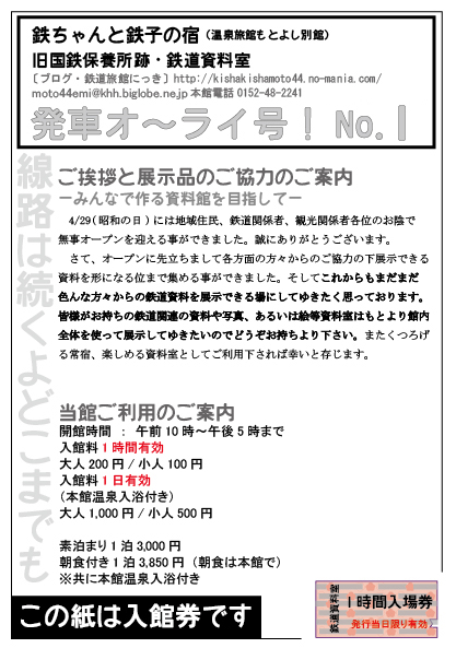 GWは遠くは東京、札幌、また網走はもとより大空町、 北見、訓子府、留辺蘂、置戸からも来館者がございました。 宿泊のご予約も着々と入り 出発進行と同時に安全運転で走行しております。 そして皆様の笑顔を拝見でき嬉しい限りです。 まだまだこれからですので 末永くご愛顧のほど宜しくお願い致します。 開業日には感謝の気持ちと記念になればという思いで お渡しするものは手作りを施しました。 記念切符はもとよし前通過時刻を 明記したオリジナル時刻表付き。 お赤飯の掛け紙には水彩画を使用。 「宿と列車と網走湖」 通常営業での入場券は券とチラシを一体化したものです。 右下にある切符デザインに 当日の日付の判を押します。 お知らせの内容が出てきたときに 内容を更新します。 来館の際チェックしてみてください。